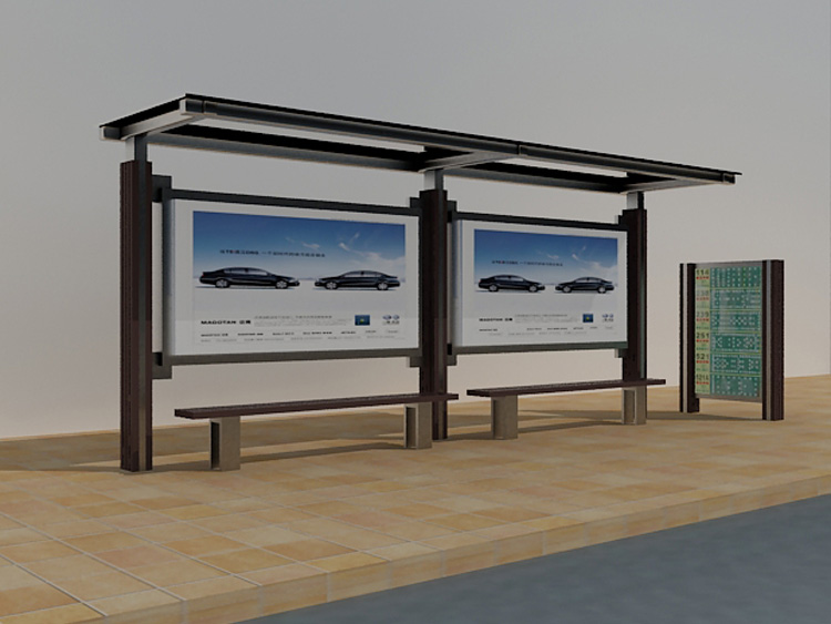 公交車候車亭一般是與公交站牌相配套的,為方便公交乘客候車時遮陽、防雨等,在車站、道路兩旁或綠化帶的港灣式公交停靠站上建設(shè)的交通設(shè)施。由于城市公交的日益發(fā)達(dá),候車亭已發(fā)展成為城市一個不可或缺的重要組成部分,設(shè)計精美的候車亭也成為了城市一道美麗的風(fēng)景。 一般候車亭棚體主要頂棚、立柱、頂弓、廣告燈箱和坐凳組成,也有用隔板來代替廣告燈箱的。
