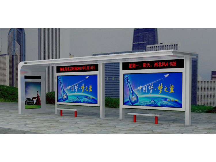 公交車候車亭一般是與公交站牌相配套的,為方便公交乘客候車時(shí)遮陽、防雨等,在車站、道路兩旁或綠化帶的港灣式公交停靠站上建設(shè)的交通設(shè)施。由于城市公交的日益發(fā)達(dá),候車亭已發(fā)展成為城市一個(gè)不可或缺的重要組成部分,設(shè)計(jì)精美的候車亭也成為了城市一道美麗的風(fēng)景。 一般候車亭棚體主要頂棚、立柱、頂弓、廣告燈箱和坐凳組成,也有用隔板來代替廣告燈箱的。