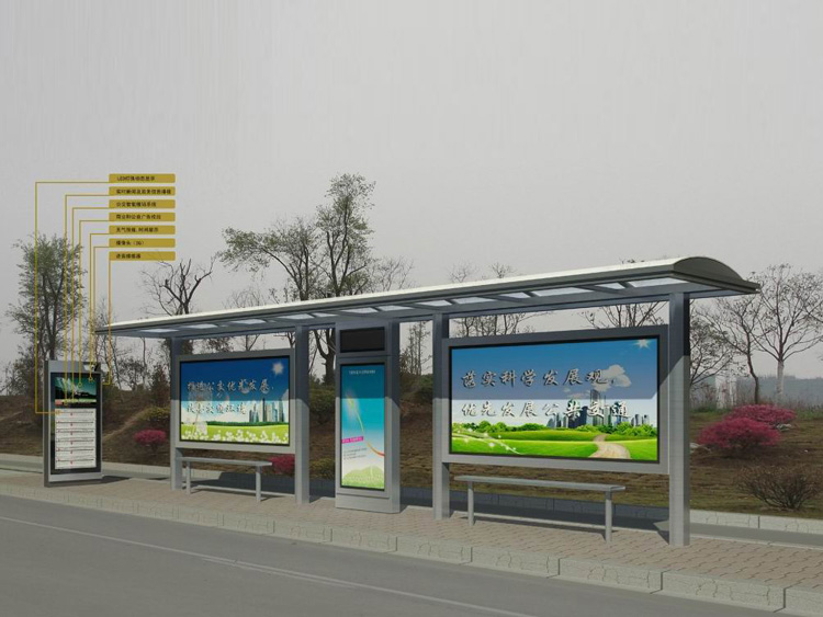 公交車候車亭一般是與公交站牌相配套的,為方便公交乘客候車時遮陽、防雨等,在車站、道路兩旁或綠化帶的港灣式公交停靠站上建設的交通設施。由于城市公交的日益發達,候車亭已發展成為城市一個不可或缺的重要組成部分,設計精美的候車亭也成為了城市一道美麗的風景。 一般候車亭棚體主要頂棚、立柱、頂弓、廣告燈箱和坐凳組成,也有用隔板來代替廣告燈箱的。