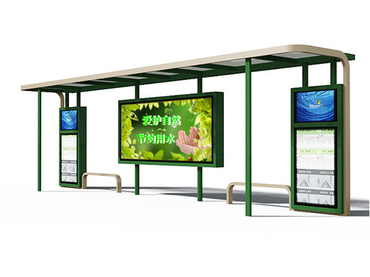 公交車候車亭一般是與公交站牌相配套的,為方便公交乘客候車時遮陽、防雨等,在車站、道路兩旁或綠化帶的港灣式公交停靠站上建設的交通設施。由于城市公交的日益發達,候車亭已發展成為城市一個不可或缺的重要組成部分,設計精美的候車亭也成為了城市一道美麗的風景。 一般候車亭棚體主要頂棚、立柱、頂弓、廣告燈箱和坐凳組成,也有用隔板來代替廣告燈箱的。